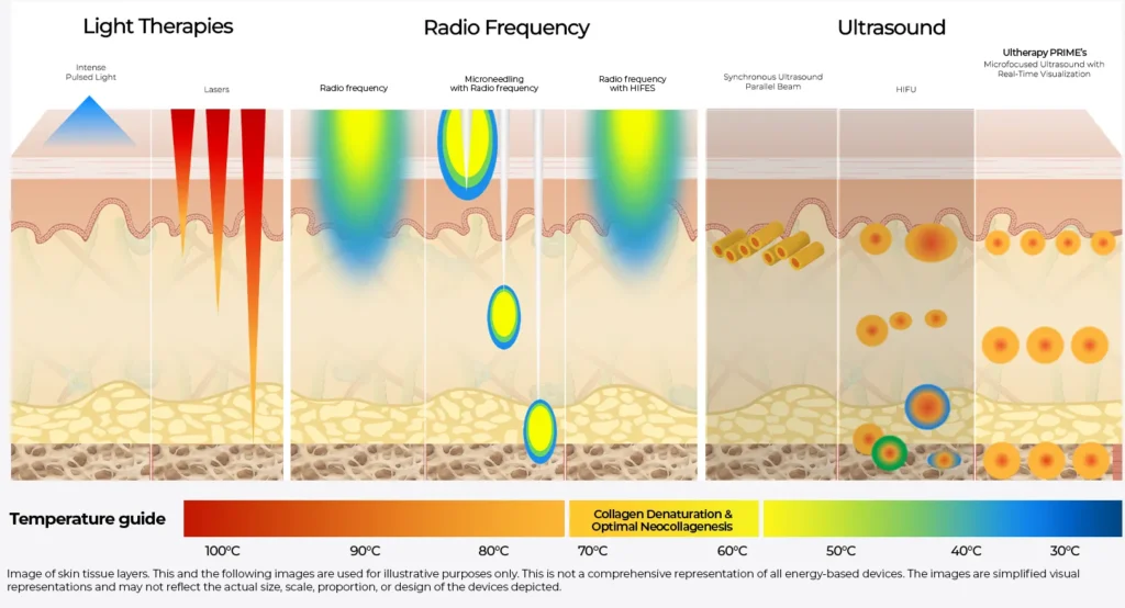 Ultherapy is the only microfocused ultrasound device with real-time visualization, enabling treatment personalization. Ultherapy allows for energy delivery precisely at 1.5mm, 3.0mm, and 4.5mm at optimal, consistent coagulative temperatures of 60–70°C, initiating collagen and elastin denaturation and synthesis for effective, reproducible results.
